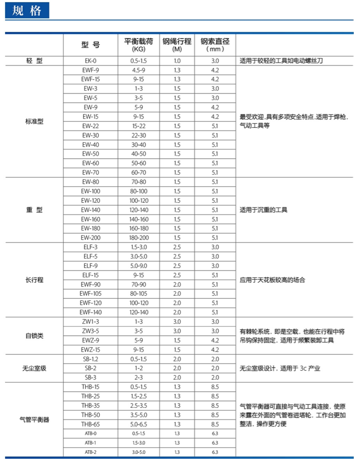 提升行程范圍為5至9英尺,覆蓋1至363磅的重量平衡要求中載、重載和超重載型號(hào)具有“零重力”特性,使操作 者以最小的力移動(dòng)工具,采用堅(jiān)固的壓鑄鋁制成中載,重載和超重載型號(hào)上的安全鎖定裝置可以防止彈 簧失效時(shí)引起的工具掉落控制裝置操作簡(jiǎn)單,可以精確地調(diào)節(jié)彈簧 。