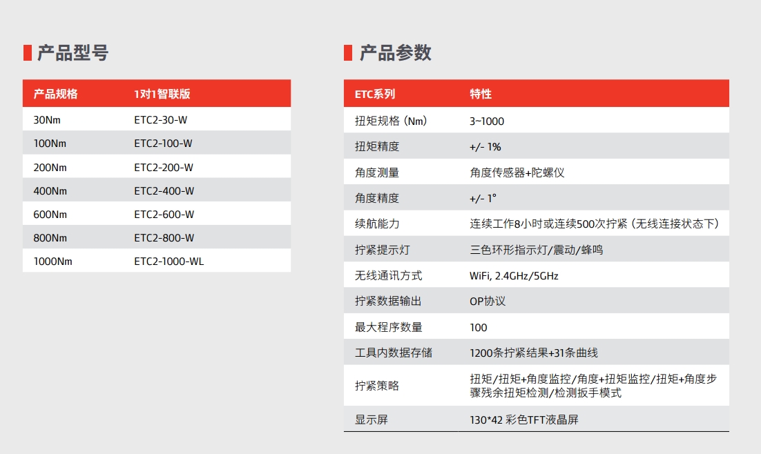 現(xiàn)代生產(chǎn)過程中常會(huì)遇到空間狹窄、動(dòng)力工具精度不足等情況,手動(dòng)定扭扳手成為不可 或缺的現(xiàn)代生產(chǎn)伙伴。 英格索蘭ETC系列數(shù)顯手動(dòng)扳手針對(duì)生產(chǎn)型應(yīng)用開發(fā),將現(xiàn)代化生產(chǎn)需求融入手動(dòng)定扭 扳手。支持?jǐn)Q緊過程無線管控,支持無線數(shù)據(jù)追溯(兼容OP協(xié)議),采用航空材質(zhì)降低重 量,同時(shí)正反精度可達(dá)±1%,全系標(biāo)配角度檢測(cè)與殘余扭矩檢測(cè)。